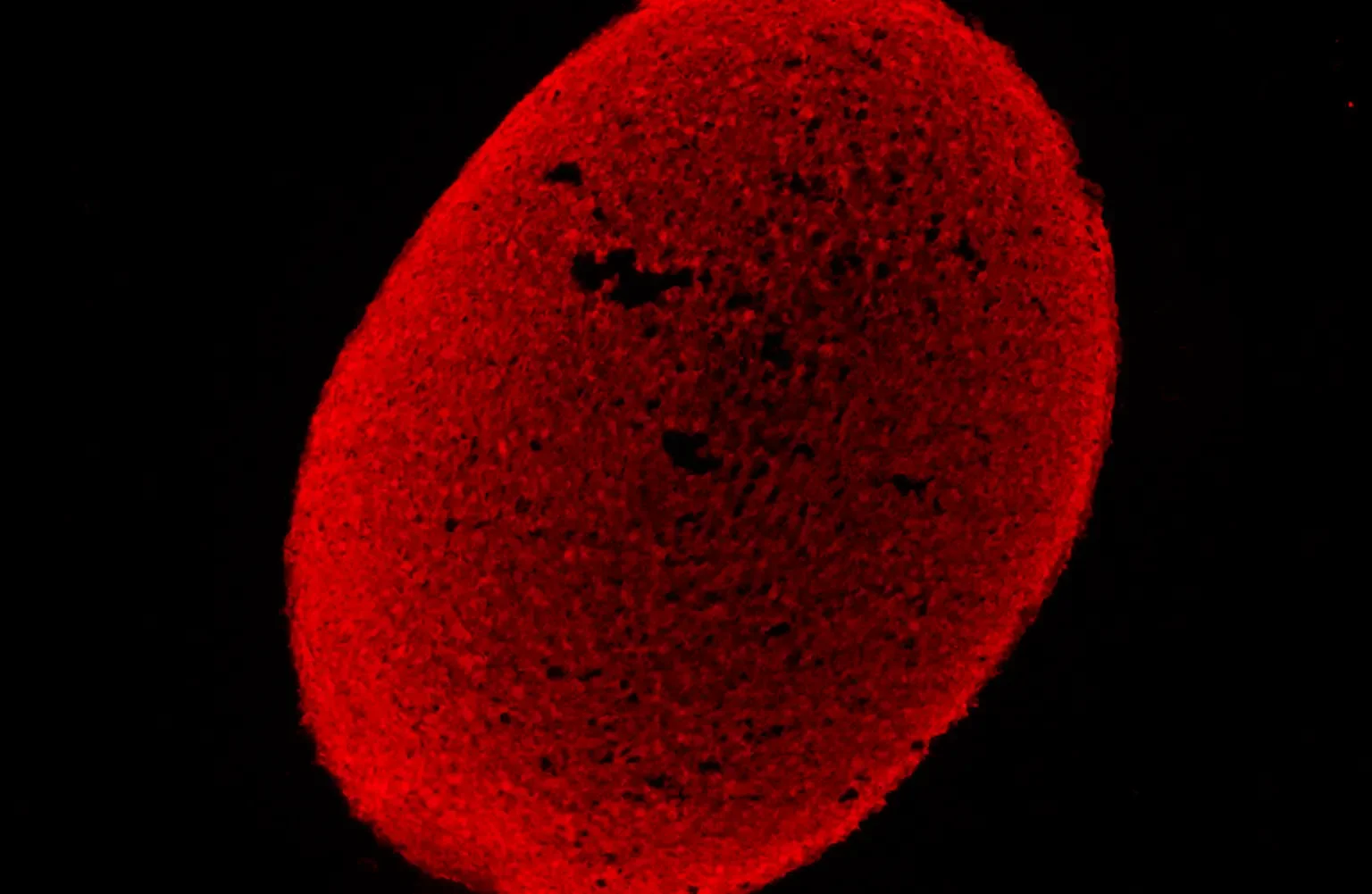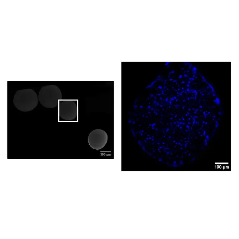 Acquisition of cortical organoids with anti-Pax6 antibody (Santa Cruz Biotechnology) (left). Zoomed-in image (right) shows a single cortical organoid. Scale bar 100 µm. Researchers can simulate and monitor development in real-time, providing critical insights into organ formation and disease modeling.