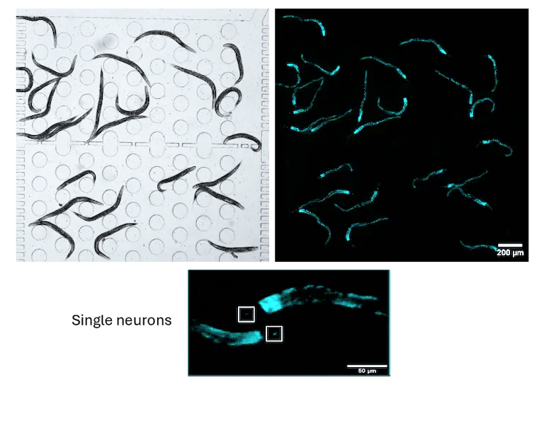 Transmission channel (left) and fluorescence channel (right) images of C. elegans with calcium indicator expression in a microfluidic chip. Scale bar 200 µm. Zoomed-in image shows single neurons with calcium indicator fluorescence in the head of C. elegans. Scale bar 50 µm.